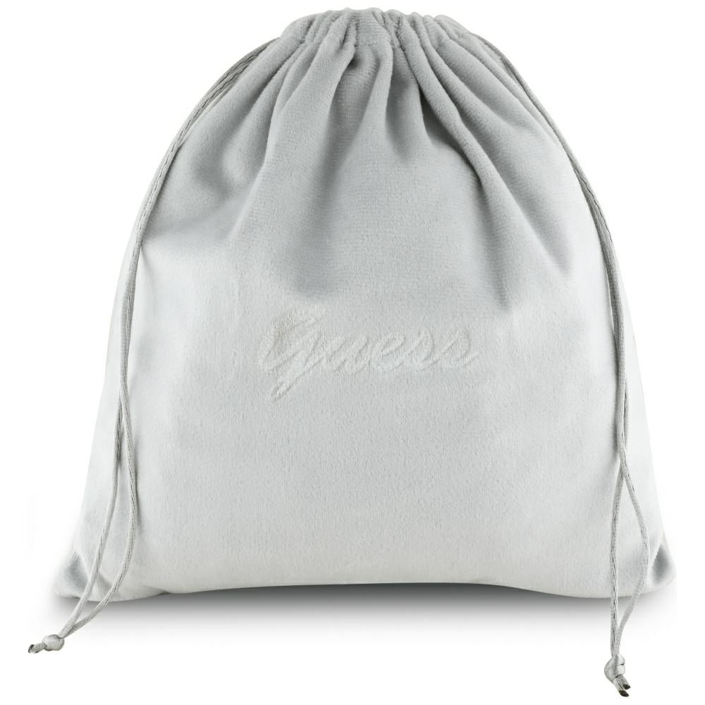 The generous cup embraces the ear, and the textile passage deliberately contrasts with metallic inserts that represent the GUESS signature.