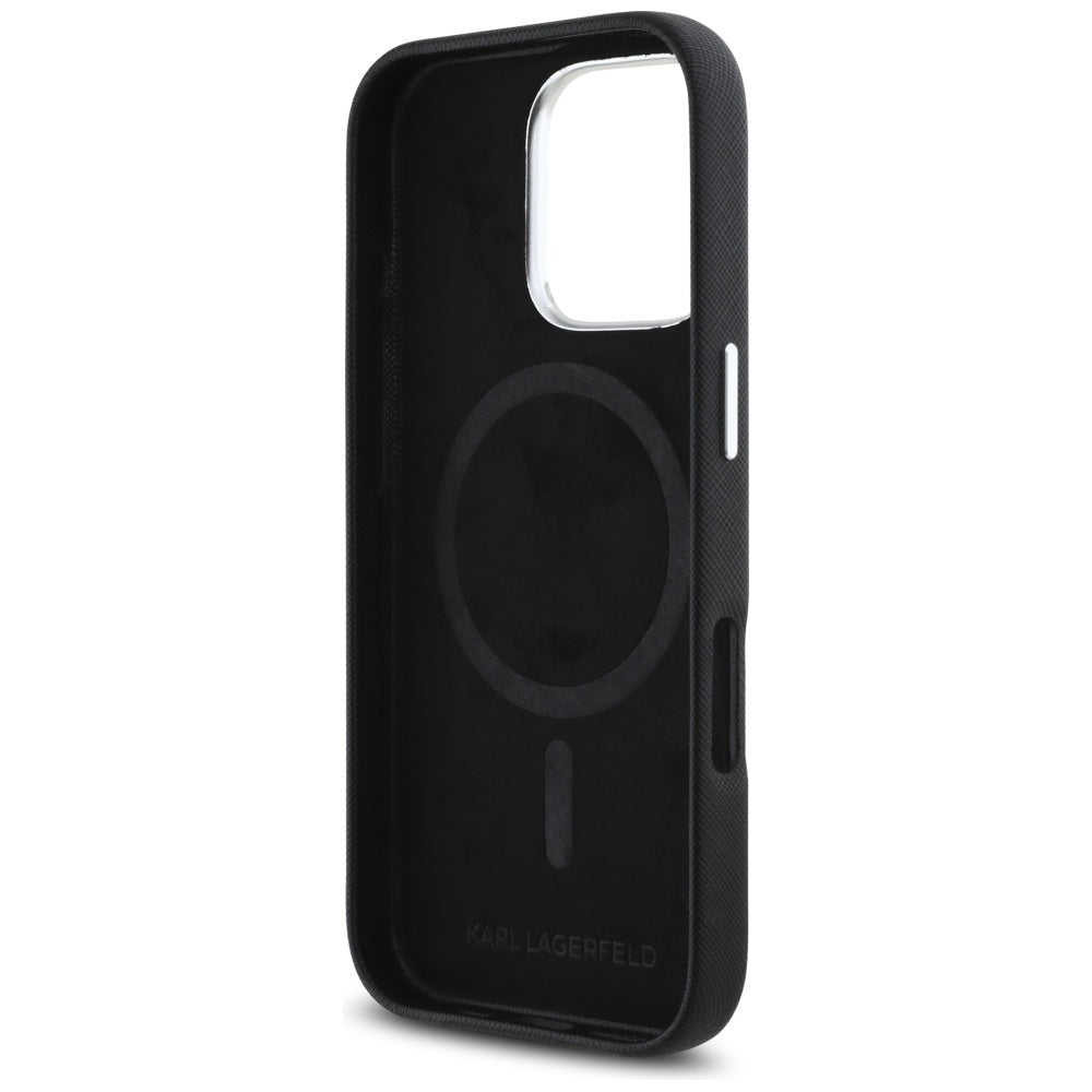 MagSafe Case for Apple iPhone 16 Pro Max, Karl Lagerfeld, Saffiano Full Wrapped Elongated Metal Logo, Black