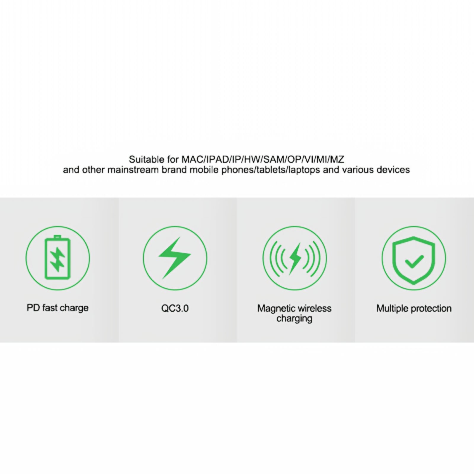 Output QI (5V / 1A / 9V / 1.67A / USB-A (4.5V / 5A / 5V / 4.5A / 5V / 3A / 9V / 2A / 12V / 1.5A) / USB-A (5V / 2.4A / USB-C (5V / 3A / 9V / 2.77A / 12V / 2A) / USB-C (5V / 3A / 9V / 3A / 12V / 3A / 15V / 3A / 20V / 2.25A)