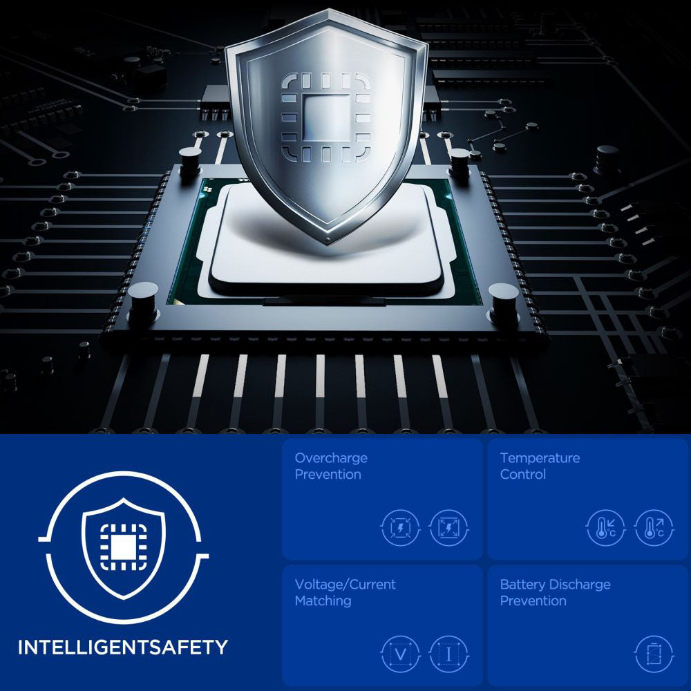 • The IntelligentSafety system ensures complete protection by preventing overcharging, controlling temperature, and safeguarding the battery for safe daily use.