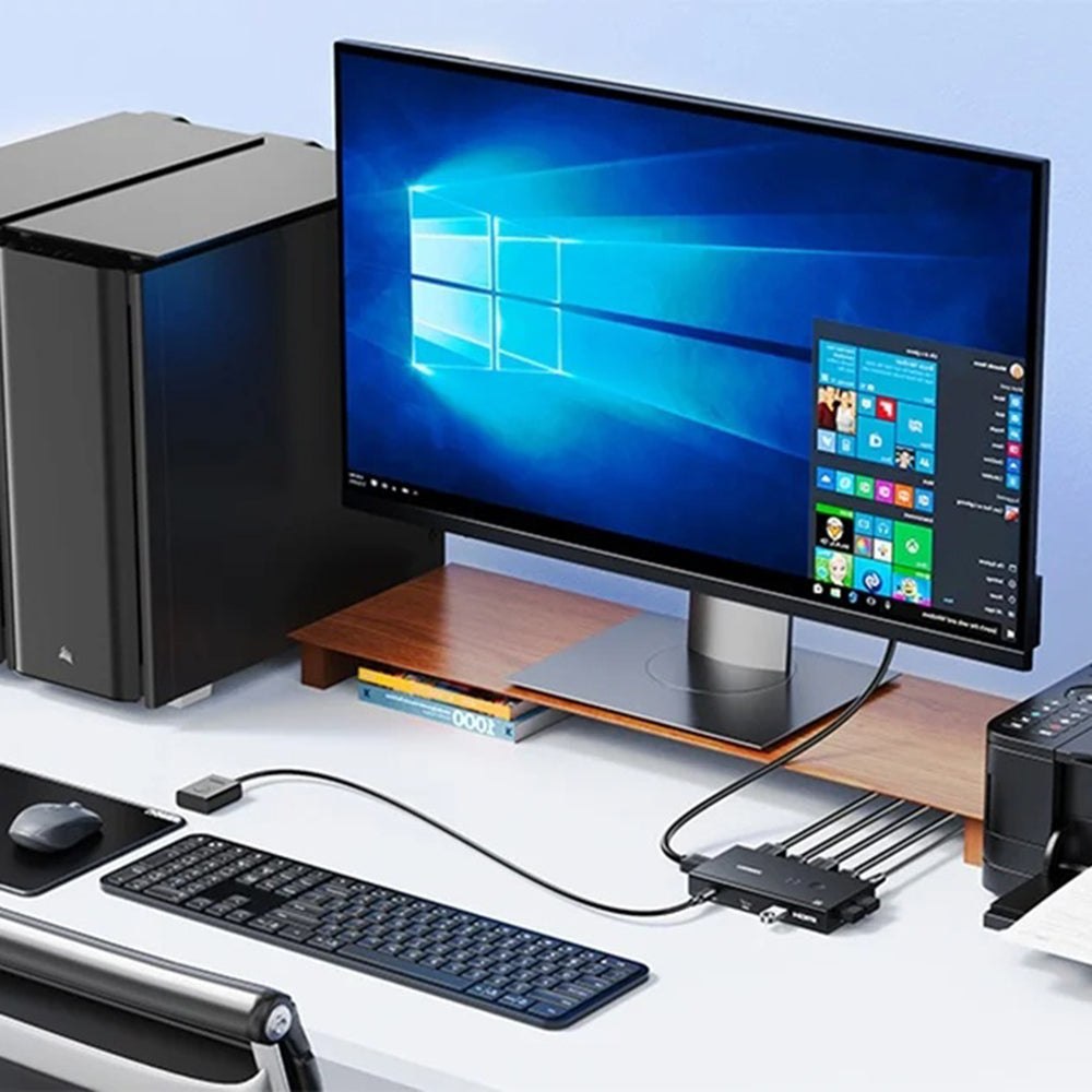 This HDMI switch allows you to use two computers in a single setup with common peripherals. Buy now!