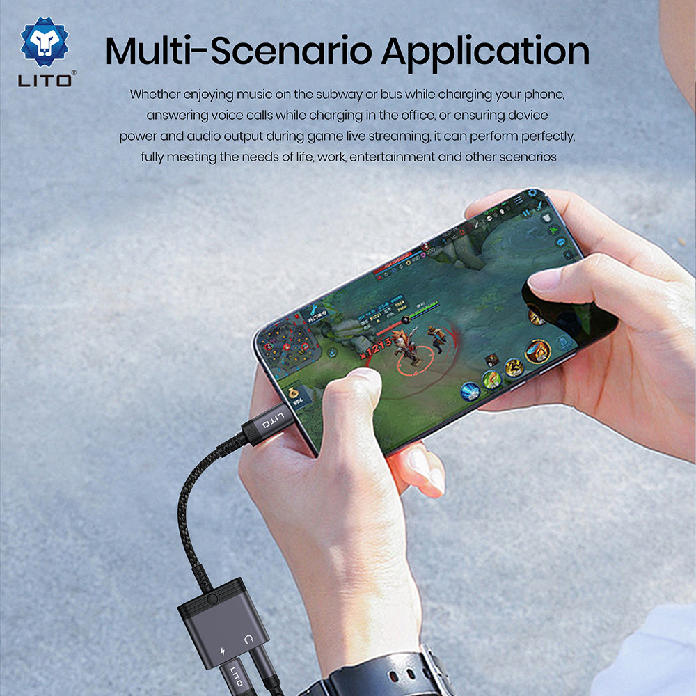 The Lito LA04T audio adapter allows you to listen to music with your 3.5mm headphones and charge your phone or tablet via USB-C at the same time,